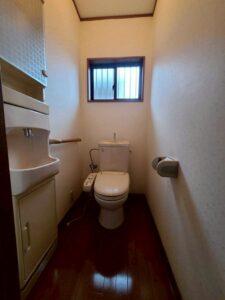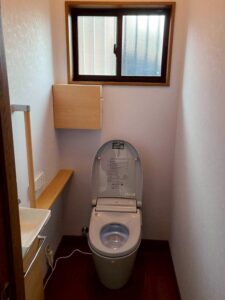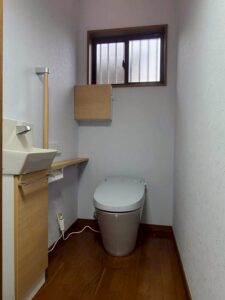 長く使われていたトイレのクロスは全面張り替え、明るく清潔感のある空間に変えさせて頂きました。
